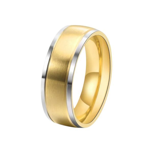 anillo de acero quirúrgico dorado con terminación mate en la parte central y con 2 líneas brillantes en el borde lateral. el anillo tiene un ionizado de oro de 18k. el ancho del anillo es de 8.0mm. existen varias medidas disponibles.