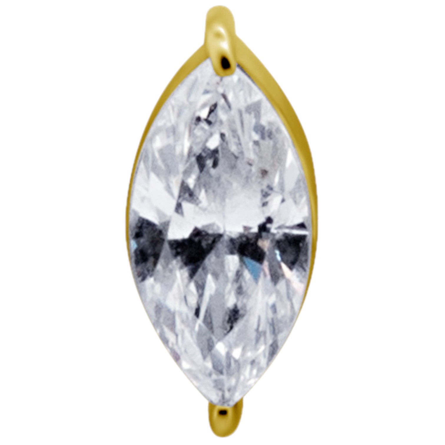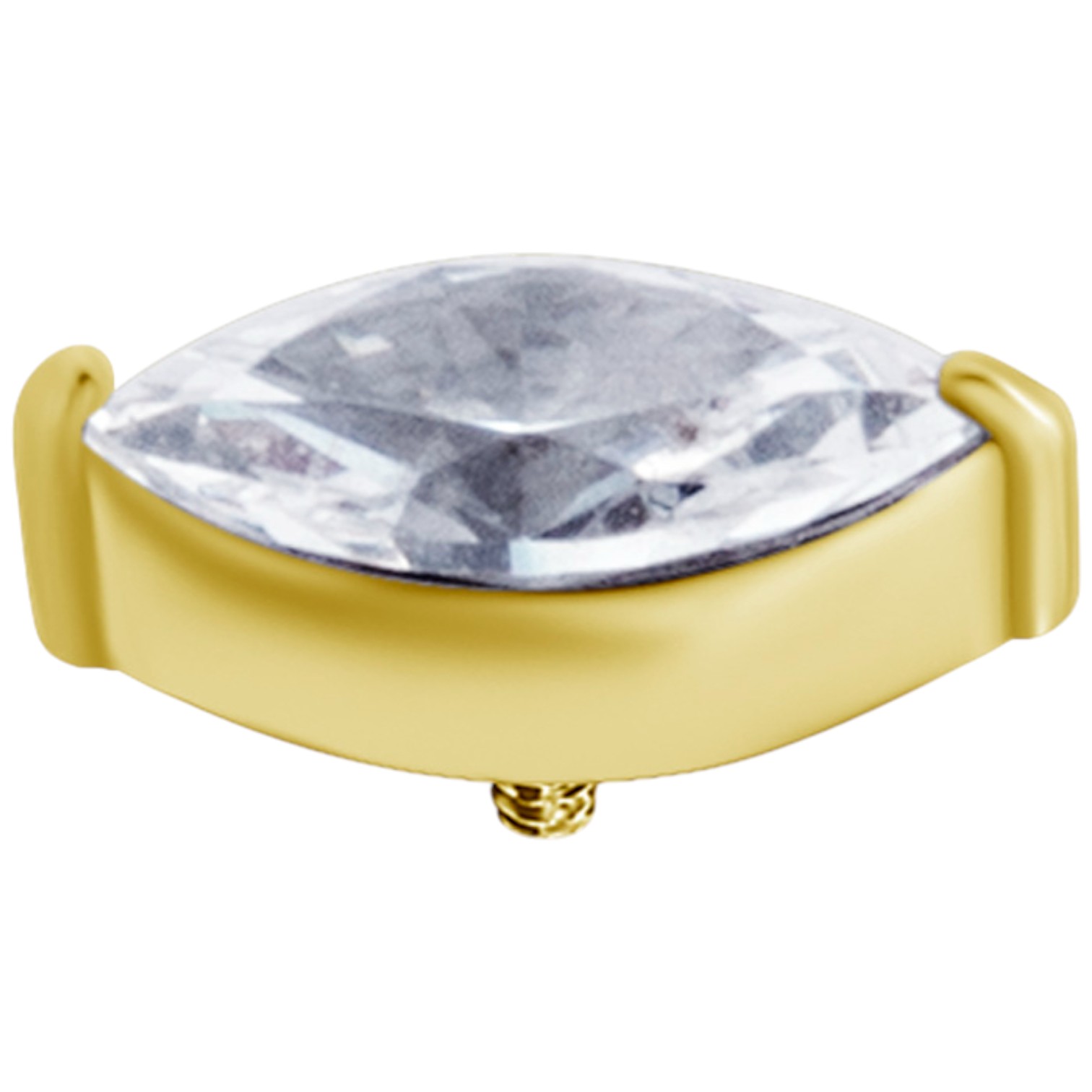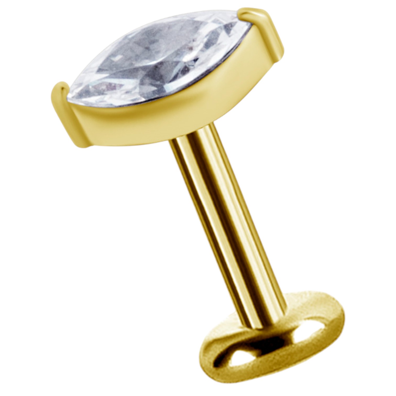 labret / helix de cromo cobalto dorado con 1 circón premium diseño marquise engarzado color blanco. cada circón viene grabado con láser.  tiene sistema de apertura y cierre por "rosca interna" que se atornilla en el eje de titanio ionizado en oro de 18k grado implante astm f-136.  esta joya puede ser usada en tu perforación inicial. el grosor del eje es 1.2mm el tamaño del diseño es de 5.0mm. está disponible en 3 largos de ejes: 6.0mm, 7.0mm, 8.0mm.