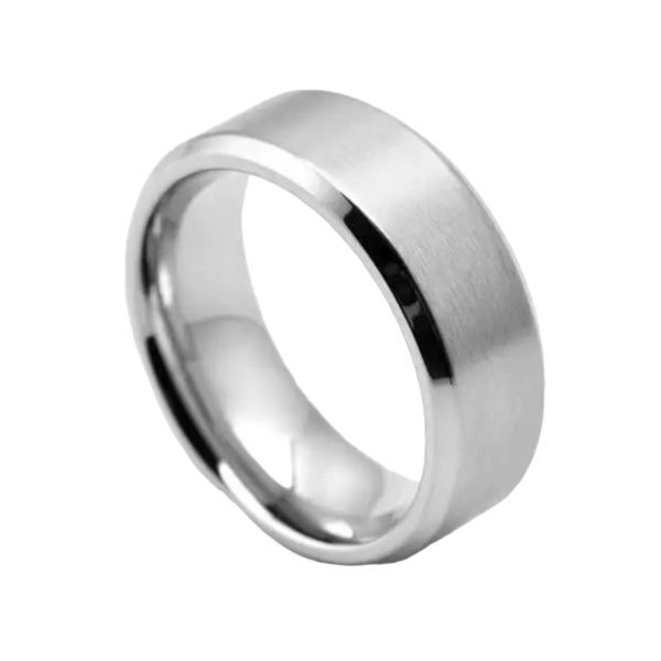 anillo de acero quirúrgico con terminación mate en la parte central y brillante en el borde lateral. tiene un ancho de 8.0mm. existen varias medidas disponibles.