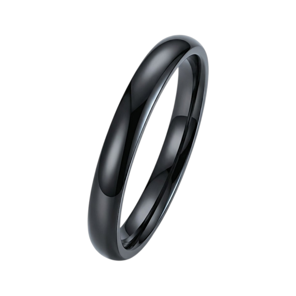 anillo de acero quirúrgico negro brillante diseño domo de 3.0mm de ancho. tiene un ionizado de color negro. existen 8 medidas disponibles.