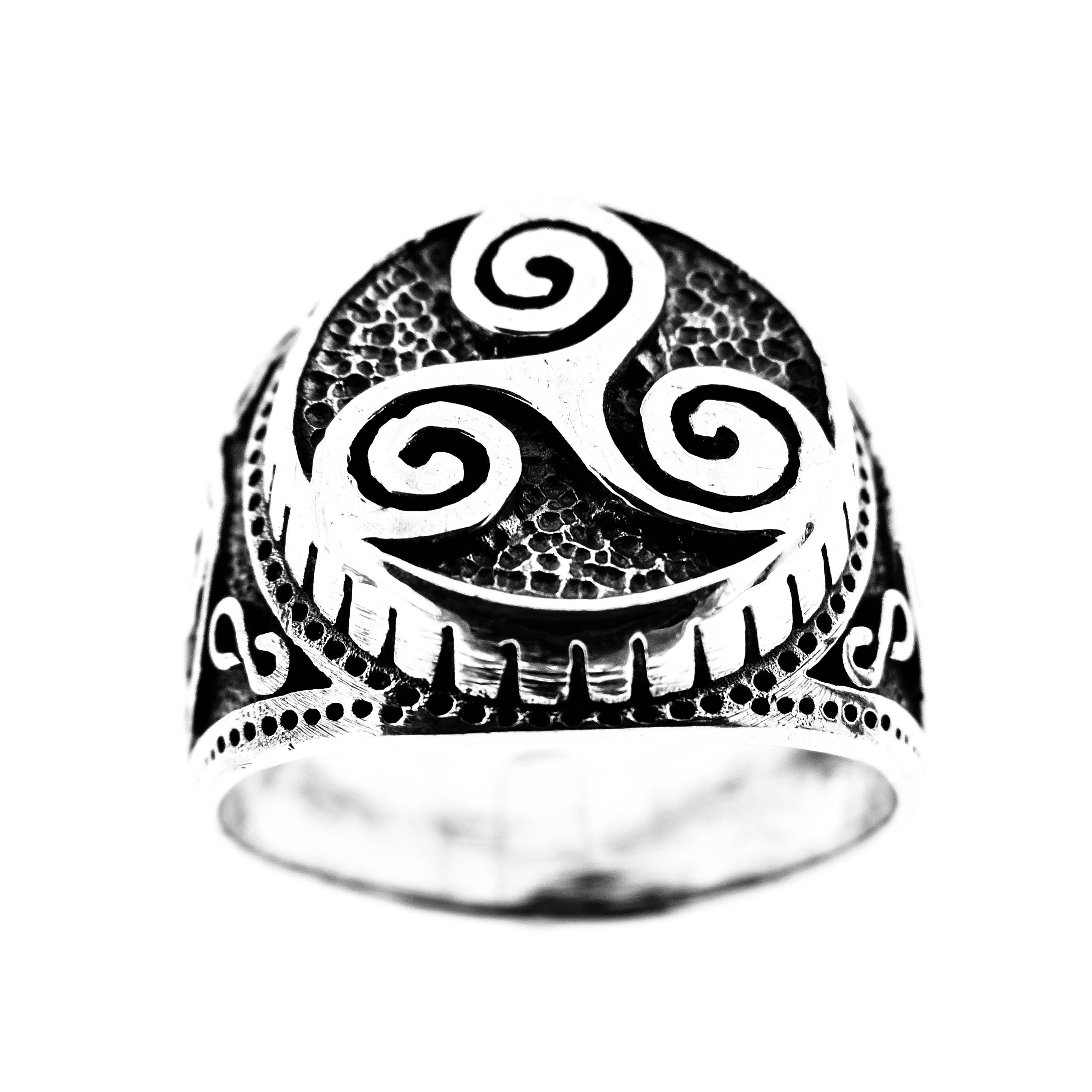anillo de plata con simbología celta trisquel infinito, este símbolo de origen celta fue usado por los druidas, entre muchas cosas simboliza el equilibrio absoluto entre todas las cosas, representa la perfección, el aprendizaje continuo, la eterna evolución . asociado además al símbolo del infinito.