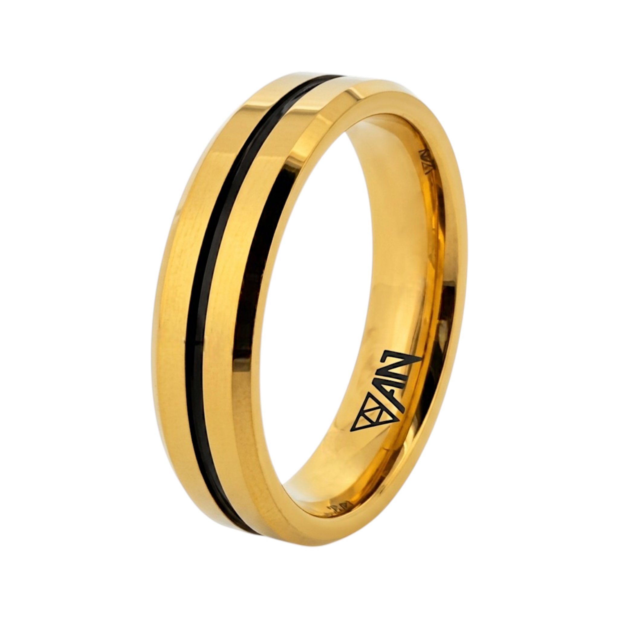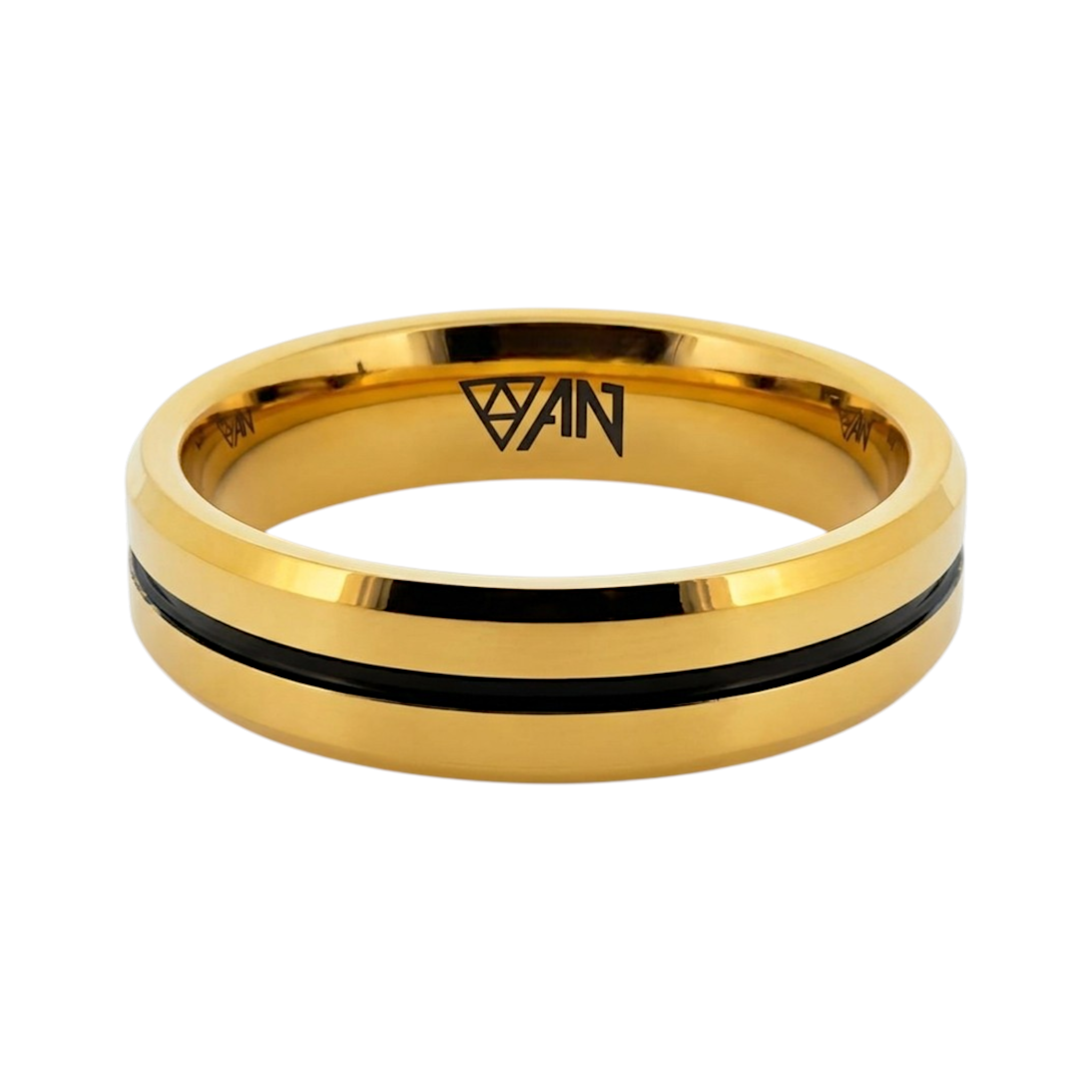 anillo de tungsteno dorado con linea central negra. tiene un ionizado de oro que se mantiene en el tiempo. el anillo tiene un grosor de 6.0mm. el tungsteno es el metal más duro y resistente que existe.