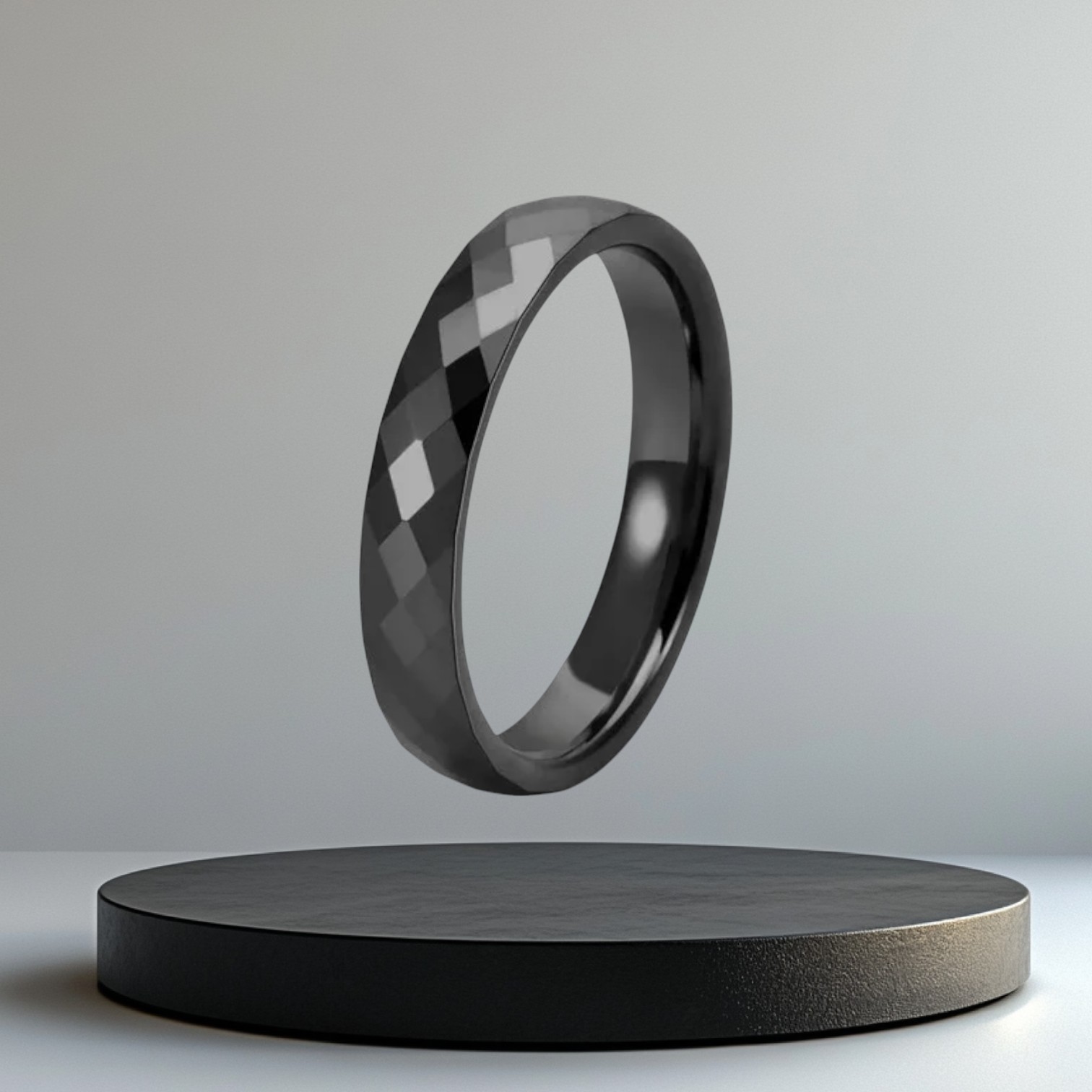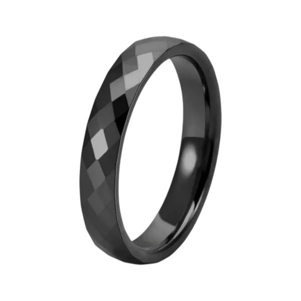 destaca con este anillo de tungsteno negro de 4.0mm de grosor, con un acabado brillante y corte diamantado que le da un reflejo único y elegante.