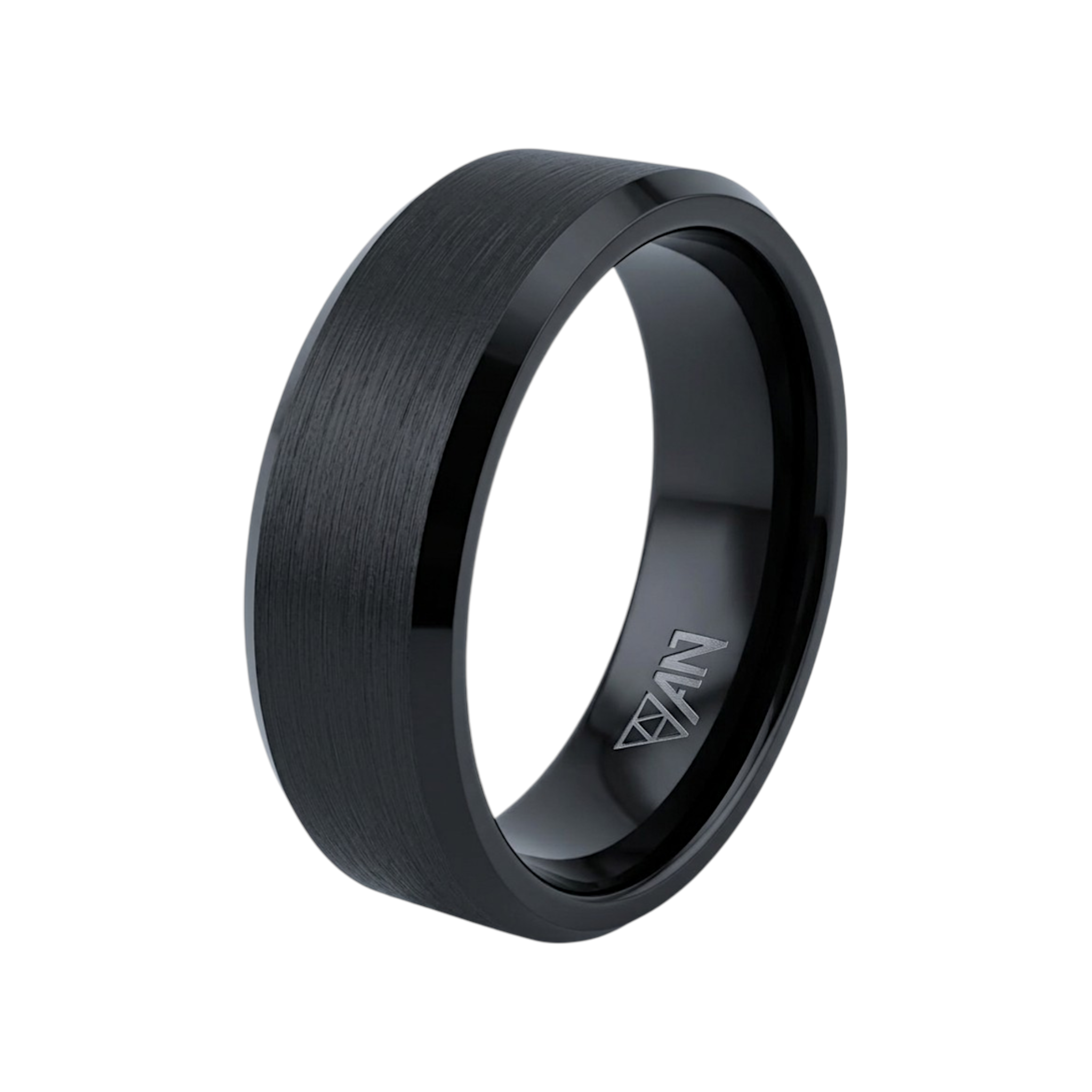 anillo de tungsteno negro mate y brillante lateral. tiene un ionizado negro que se mantiene en el tiempo y con un grosor de 6.0mm. el tungsteno es el metal más duro y resistente que existe.