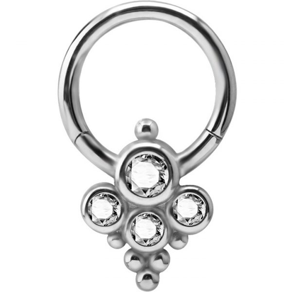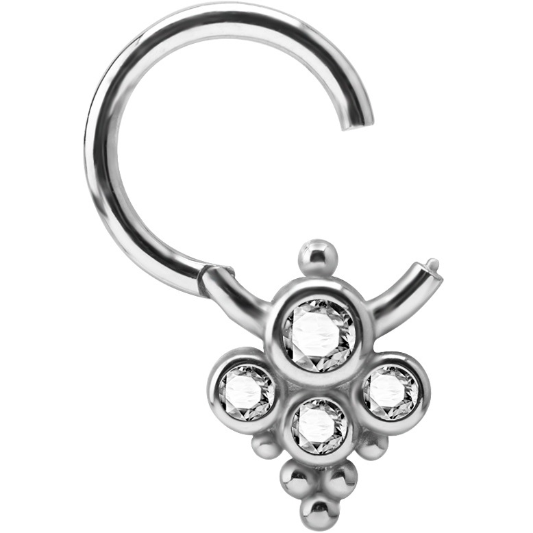 Argolla acero continua clicker  diseño cluster con tetra cristales swarovski de 4mm y 3mm. esta argolla tiene un sistema de apertura clicker con bisagra. disponible solo en color blanco. esta argolla puede ser usada en el helix, septum o daith  .  medidas: 1.2x8mm y 1.2x9mm.