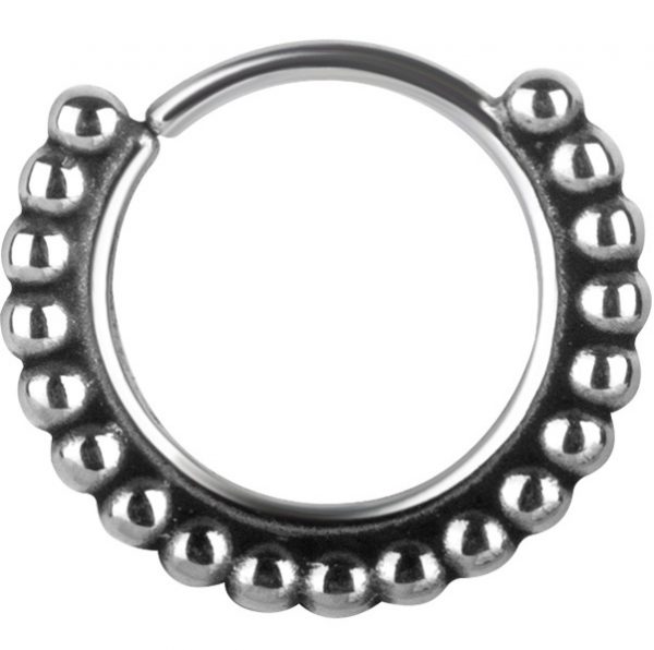 argolla de acero quirúrgico para nariz diseño hindú. tiene sistema de apertura lateral un tratamiento bajo altas temperaturas logra que la argolla pueda ser maleable a pesar de ser acero quirúrgico. el grosor de la argolla es de 0.8mm y hay dos diámetros internos a elegir: 7.0 y 8.0mm.