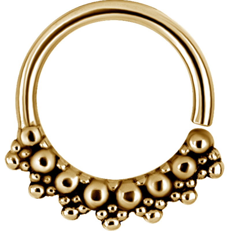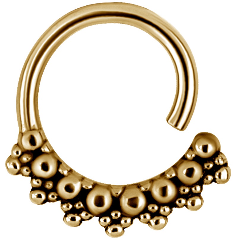 argolla de acero quirúrgico dorado de nariz diseño hindú. tiene sistema de apertura lateral. un tratamiento bajo altas temperaturas logra que la argolla pueda ser maleable a pesar de ser acero quirúrgico. la argolla está ionizado en oro puro de 24k. el grosor de la argolla es 0.8mm y diámetro interno a elegir: 8.0mm.