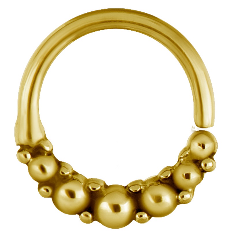 argolla de acero quirúrgico dorado  nariz diseño hindú. tiene sistema de apertura lateral. un tratamiento bajo altas temperaturas logra que la argolla pueda ser maleable a pesar de ser acero quirúrgico. la argolla está ionizado en oro puro de 24k. el grosor de la argolla es 0.8mmun diámetro interno de 8.0mm.
