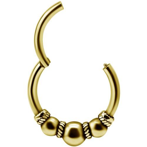 argolla continua clicker de acero quirúrgico dorado diseño triple bolita ethnic. tiene un ionizado de oro puro de 24 kilates. por sus dimensiones es ideal para ser usada en el lóbulo o conch.  tienen el sistema de apertura clicker con bisagra, lo que te permite una instalación rápida y segura.