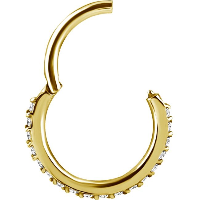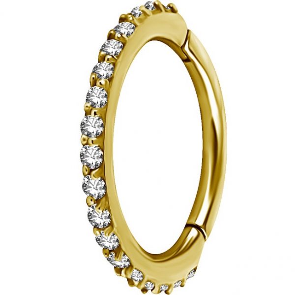 argolla de acero quirurgico dorado continua clicker con circones  premium blancos. tiene un ionizado de oro puro de 24 kilates. por sus dimensiones está diseñada especialmente para ser usada como argolla de nariz. tiene sistema de apertura clicker con bisagra lo que te permite una instalación rápida y segura. sus medidas son:  1.0x6mm, 1.0x7mm, 1.0x8mm y 1.0x9mm.