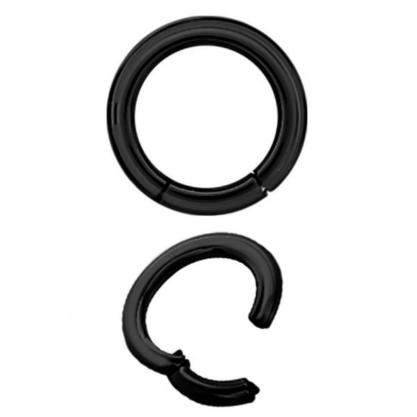 argolla continua clicker con apertura de bisagra de acero quirúrgico negro de 3.2mm. tiene un ionizado de color negro biocompatible que permanece en el tiempo. existen varios diámetros interiores para elegir.