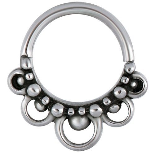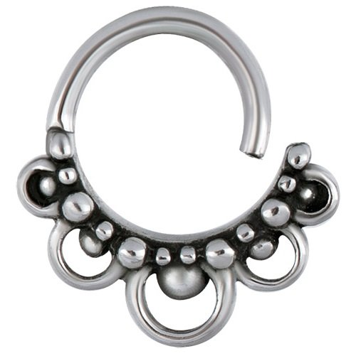 argolla de nariz de acero quirúrgico con diseño hindú esta argolla tiene un sistema de apertura lateral. un tratamiento bajo altas temperaturas logra que la argolla pueda ser maleable a pesar de ser acero quirúrgico. el grosor de la argolla  es 0.8mm y hay dos diámetros internos a elegir: 7.0 y 8.0mm. esta argolla puede ser usada en la nariz así como en el cartílago de la oreja.