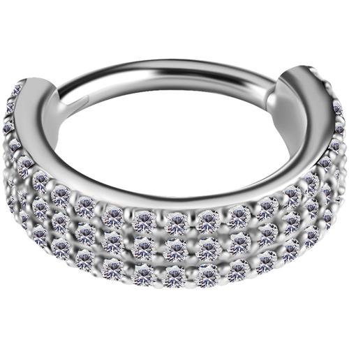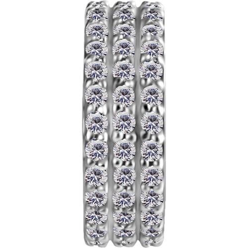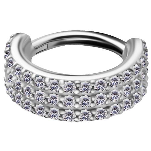 argolla de cromo cobalto (co cr nf) continua clicker con triple corrida de circones premium blancos engarzados. cada circón viene grabado con láser “premium zirconia”la medida de 1.2 x 8.0mm tiene 51 circones y la 1.2 x 10mm tiene 66 circones. esta argolla está diseñada para ser usada en el hélix, lóbulo, tragus, conch de la oreja.