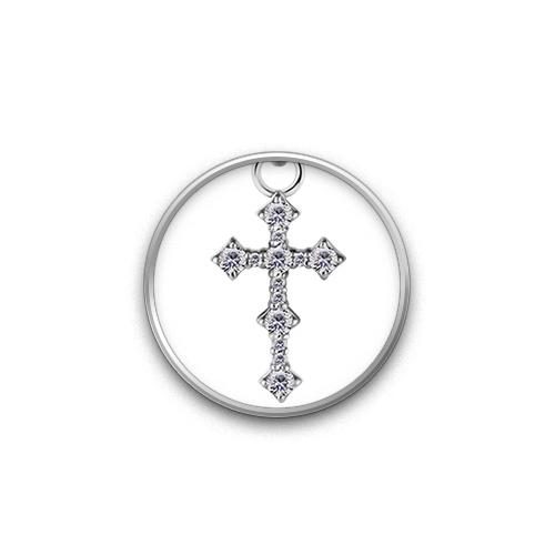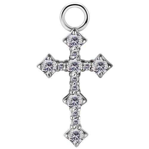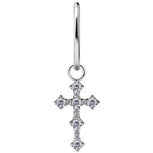 argolla de plata con sistema de bisagra y charm colgante de cromo cobalto diseño cruz con 13 circónes premium engarzados color blanco. la argolla de plata está disponible en 3 diámetros internos. las medidas disponibles son: 1.2 x 8mm, 1.2 x 10mm y 1.2 x 12mm. el grosor bisagra es de 0.6mm