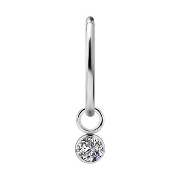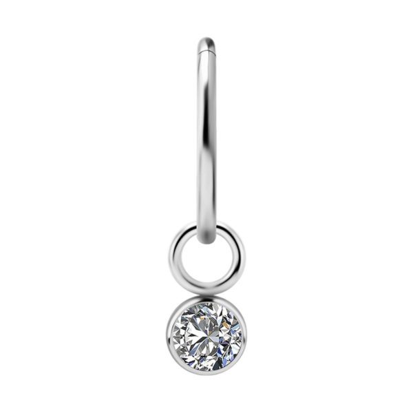 argolla de plata con sistema de bisagra y charm colgante de titanio con 1 circón premium engarzado redondo. tienes 2 diametro de circon para elegir 4.0mm y 5.0mm.  la argolla de plata está disponible en 3 diámetros internos. las medidas disponibles son: 1.2 x 8mm, 1.2 x 10mm y 1.2 x 12mm. el grosor bisagra es de 0.6mm
