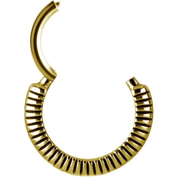 argolla septum /helix  de acero quirúrgico dorado con diseño líneas verticales. tiene un ionizado de oro puro que se mantiene en el tiempo. esta joya también puede ser usado en el lóbulo  de la oreja. todos nuestras argollas tienen el sistema de apertura clicker con bisagra, lo que te permite una instalación rápida y segura.
