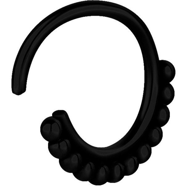 Argolla de acero quirúrgico con ionizado color negro y diseño hindú, un tratamiento bajo altas temperaturas logra que la argolla pueda ser maleable a pesar de ser acero quirúrgico. el grosor de la argolla es de 1.2mm y su diámetro interior son 2: de 8mm y  10mm. esta argolla es muy  versatil y permite ser usada en diferentes parte de la oreja como en el  lobulo o el helix,  asi como en el septum de la nariz.