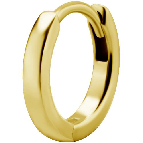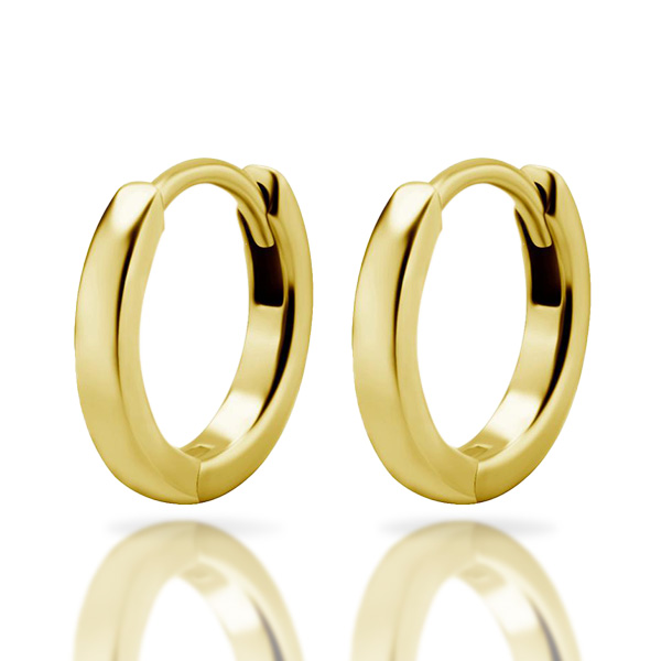 argollas de acero quirúrgico dorado de superficie plana cuadrada. tiene un ionizado de oro puro de 24 kilates. tiene apertura de bisagra y en 3 diámetros  internos de 6.0mm, 8.0mm y 10mm. diámetros externos de 9, 11 y 13 mm. el ancho de esta argolla es de 1.7mm. por sus dimensiones es ideal para ser usa lóbulo de la oreja o helix.