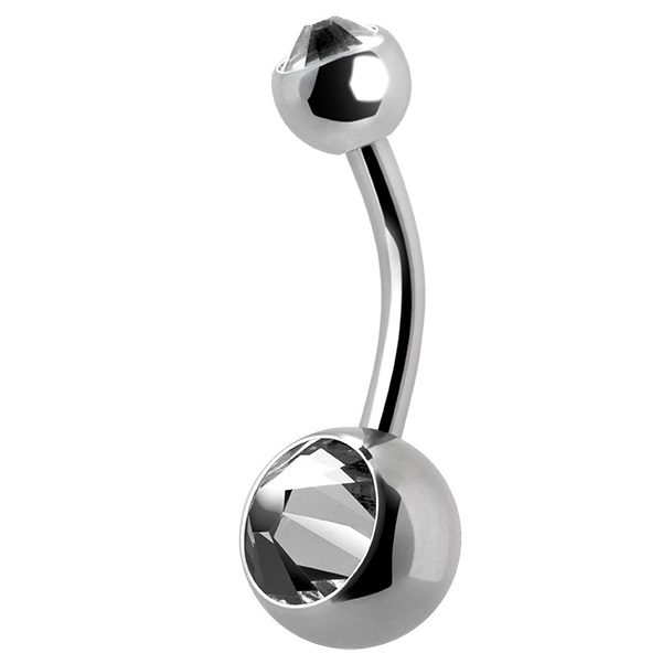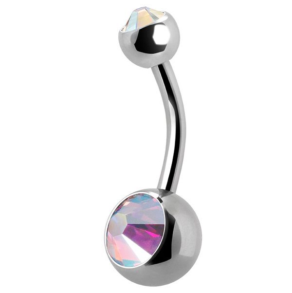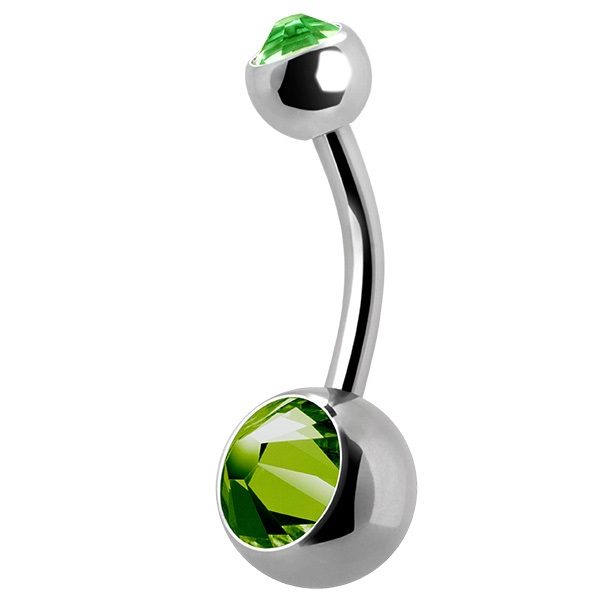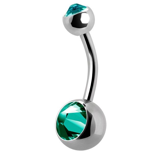 banana para el ombligo  de titanio. el banano tiene en ambas bolitas  cristales swarovski con una medida de 4mm y 6mm mas pequeñas .tiene una amplia gama de colores: blanco, tornasol, turquesa y verde. el largos es de 10mm, el grosor de la barra es 1.6mm. el titanio es completamente hipoalergénico, por lo tanto el mas apropiado para la perforación inicial.