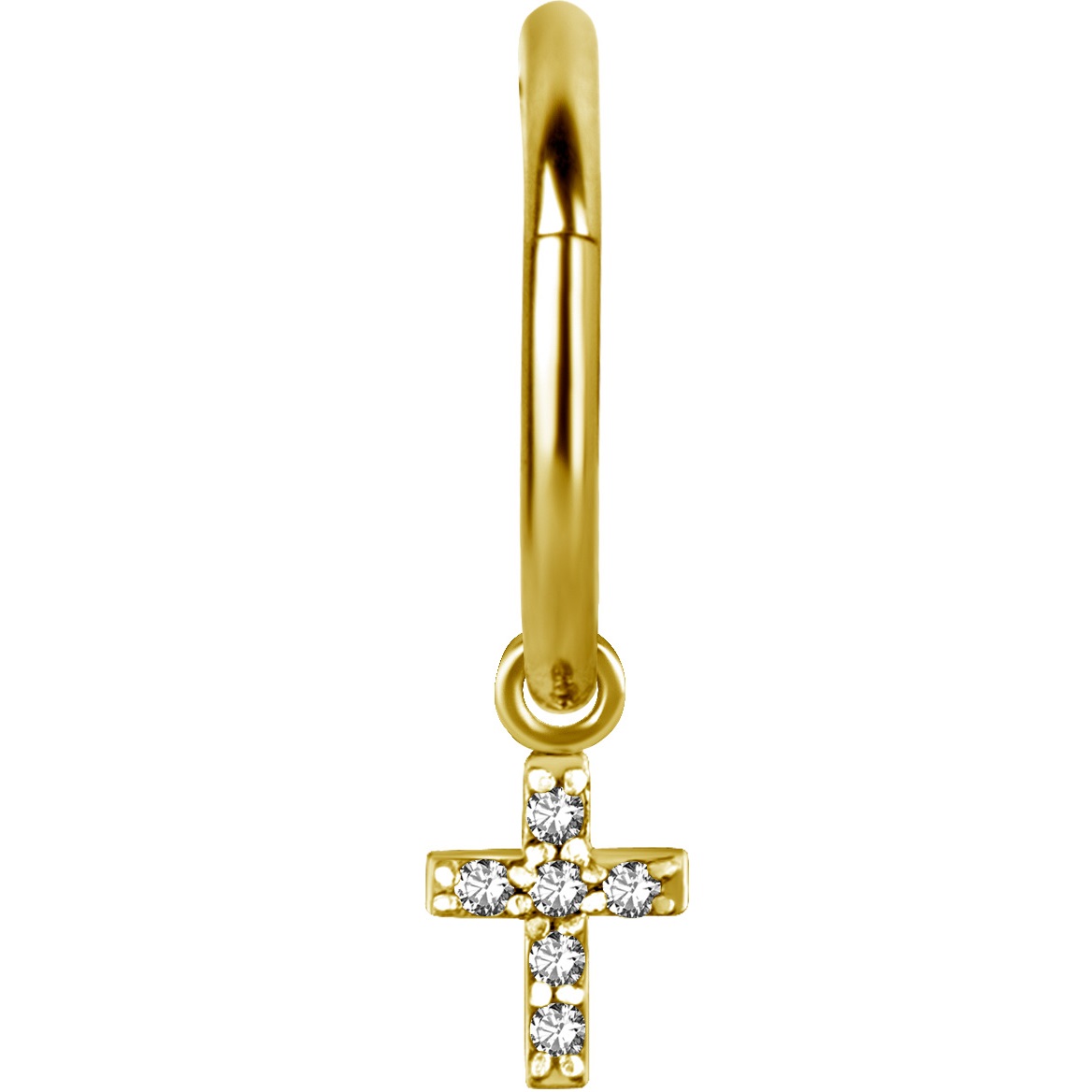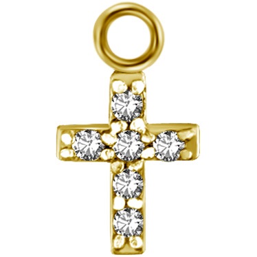 Accesorio charm de acero quirúrgico dorado con un ionizado de oro y diseño cruz  con circones para ser usado en argollas continuas clicker. sus dimensiones son de 6mm x 4mm. (este accesorio sirve para ser usado en argollas de hasta 2mm de grosor).