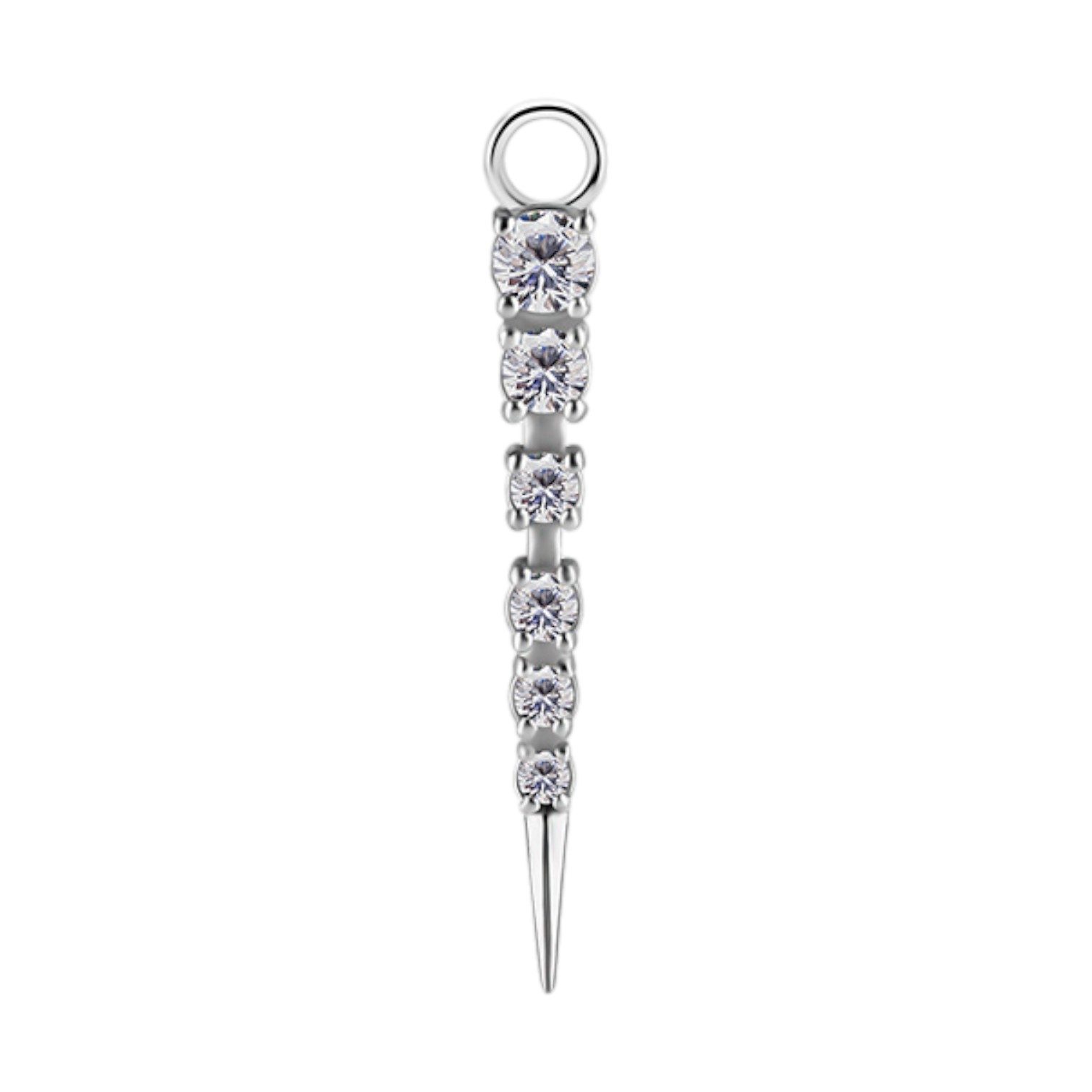 charm de cromo cobalto de diseño estaca con 6 circones premium engarzados para ser usado en argollas con bisagra. cada circón viene grabado con láser la palabra “premium zirconia”. sus dimensiones son de 24mm de largo. este accesorio sirve para ser usado en argollas de hasta 1.6mm de grosor.