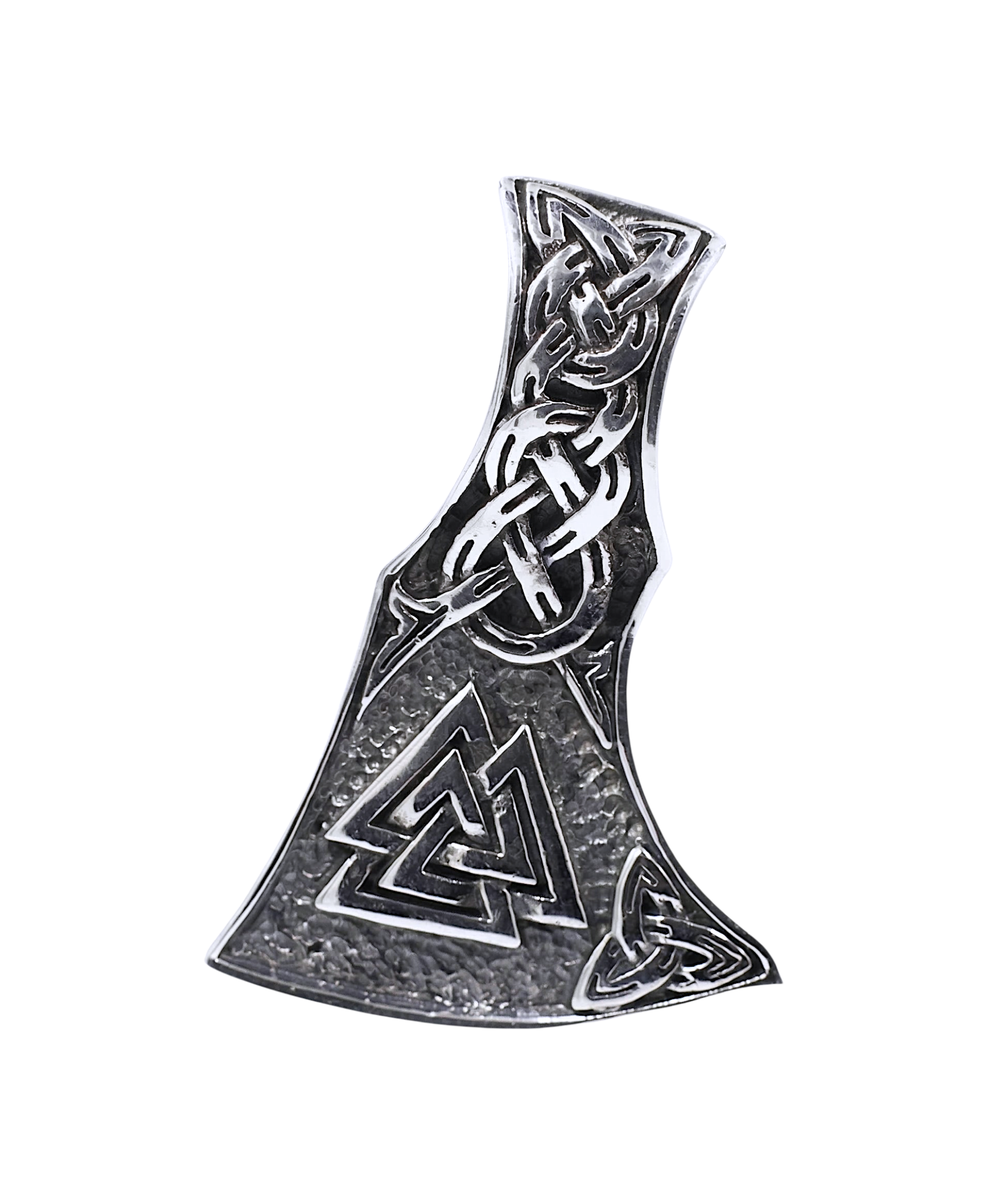 hacha vikinga hecha de réplica original  de plata. tiene diseño valknut o nudo de la muerte. sus dimensiones son las siguientes: