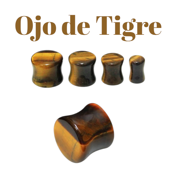 expansión plug de piedra ojo de tigre (tiger eye). esta piedra natural es de una combinación de color cafe amarillo y dorado. medidas disponibles: 4.0 a 20mm.