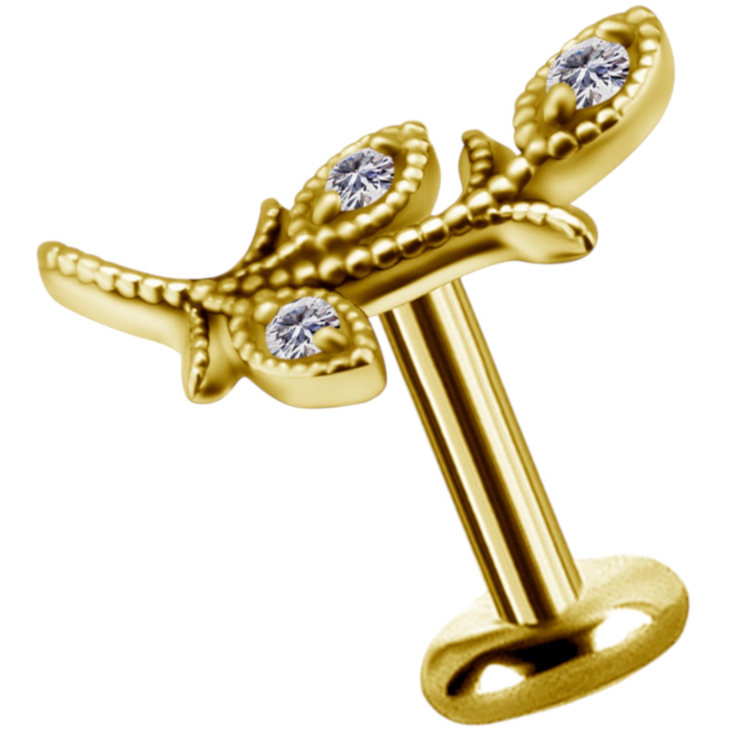 helix de cromo cobalto dorado diseño hojas left con 3 circones premium engarzados. cada circón viene grabado con láser “premium zirconia”. esta joya tiene un ionizado de oro de 18k . tiene sistema de apertura y cierre  por "rosca interna", este se atornilla en un eje de titanio grado implante astm f-136.  puede ser usada en tu perforación inicial. el tamaño del diseño hojas es de 12 x 6 mm . está disponible en 3 largos de ejes: 6.0mm, 7.0mm, 8.0mm.