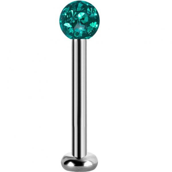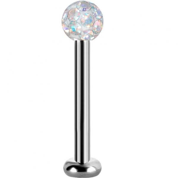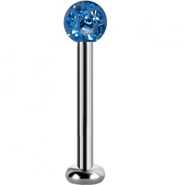 labret de titanio astm f-136 con multicristales swarovski de distintos colores. la bola  de 3.0mm. cada bolita posee en su interior una base de titanio roscada  y los cristales están cubiertos por una resina epóxica que los protege frente al ambiente. el grosor de la barra es de 1.2mm y los largos de barra disponibles son: 6, 7, 8, 10 y 12mm.