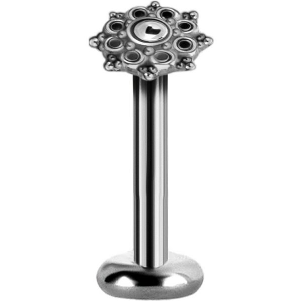 labret /helix de acero quirúrgico  diseño mandala de flor  hindu de 6.0mm de diámetro, el sistema de apertura es a través de rosca interna sus medidas son de 1.2mm de grosor, y tiene 2 largos disponibles de 7mm ideal para el cartílago de la oreja y 8mm para el labio.