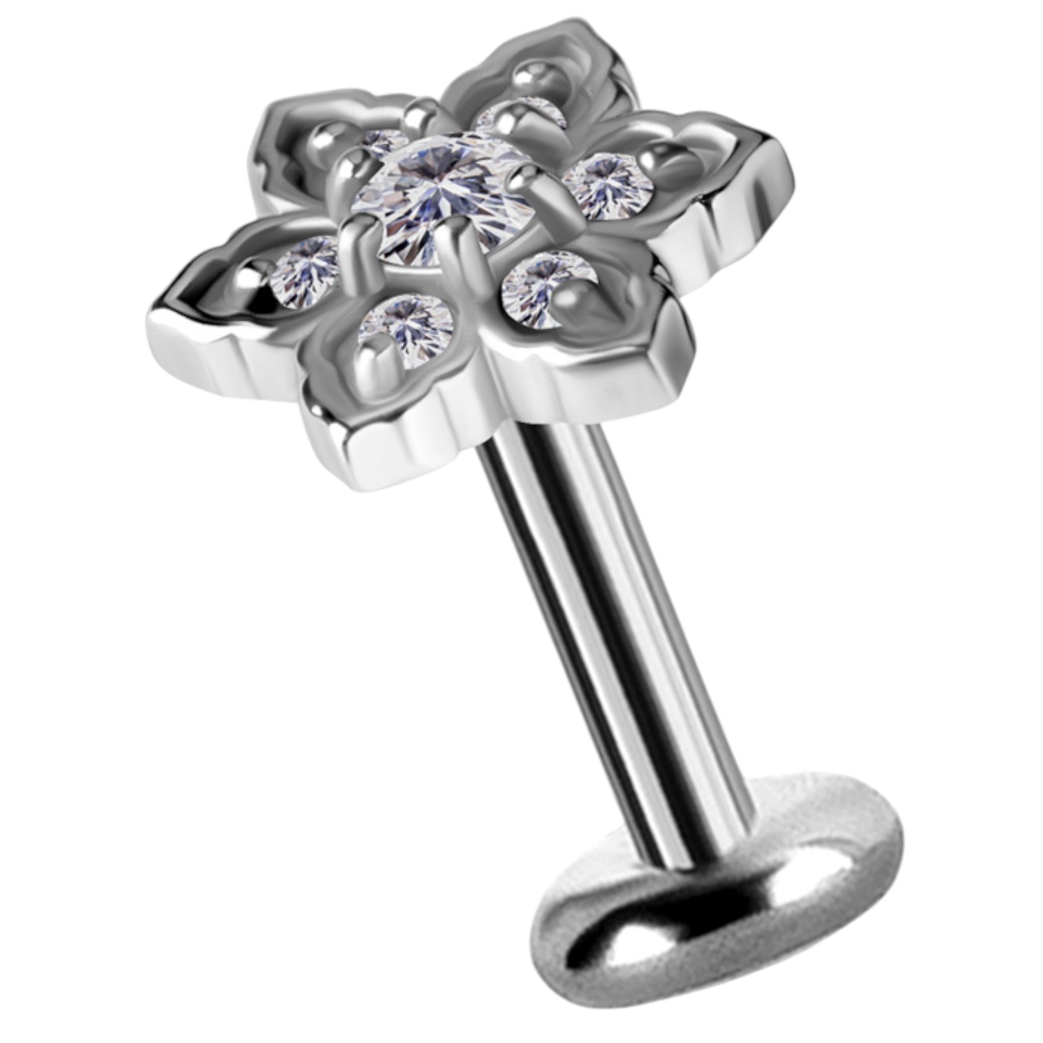 labret / helix de cromo cobalto (co cr nf) diseño flor con 7 circones premium engarzados en forma de garra. cada circón viene grabado con láser. tiene sistema de apertura y cierre por "rosca interna". se atornilla  en el eje de titanio grado implante (astm f-136).  esta joya puede ser usada en tu perforación inicial. el tamaño del diseño flor es de 6.3mm de diámetro . está disponible en 3 largos de ejes: 6mm, 7mm, 8mm.