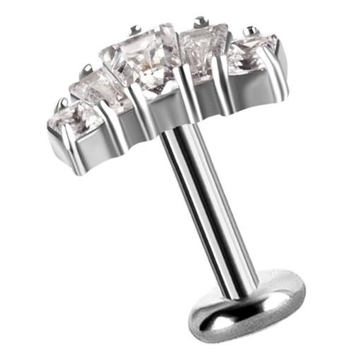 labret / helix de cromo cobalto diseño “taper fan” con 5 circones premium blancos engarzados. tiene un nuevo sistema de apertura y cierre  “push-pin” con un pin de fijación que entra a presión en el eje de titanio grado implante astm f-136. este material  es ideal para ser usado en una perforación inicial.