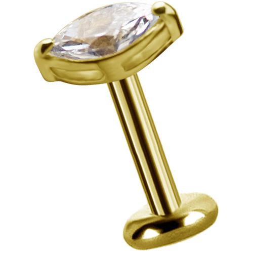 labret / helix de titanio dorado con top de oro 18k  con 1 circón premium diseño “marquise” engarzado color blanco. tiene sistema de apertura y cierre  por «rosca interna». el material  de esta joya permite ser usada como perforación inicial.