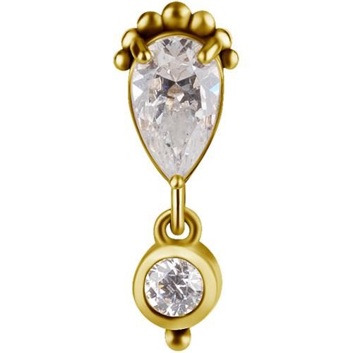 este labret de titanio dorado con top de oro sólido 18k en diseño gota dangle con circones premium es una pieza elegante y sofisticada que destaca por el movimiento del circón y su brillo. ideal para perforaciones como helix, flat o lóbulo, aporta un toque delicado y llamativo a cualquier estilo.