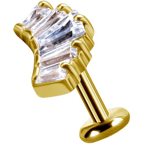labret / helix de titanio dorado y top de oro solido de 18k diseño tappered baguette con circones premium engarzados.  el eje de titanio astm f-136 tiene un ionizado de oro puro. su sistema de apertura y cierre es a través de «rosca interna». el material  de esta joya permite ser usada como perforación inicial.
