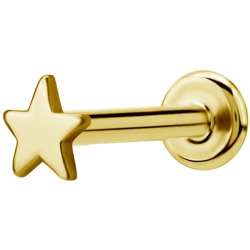 labret / helix de titanio dorado astm f-136 diseño estrella con sistema de apertura por rosca interna. tiene un ionizado de oro puro de  24 kilates que se adhiere al titanio y se mantiene en el tiempo. el grosor del eje es de 1.2mm y tienes 3 largos para elegir. el diseño de la estrella es de 4.0mm.