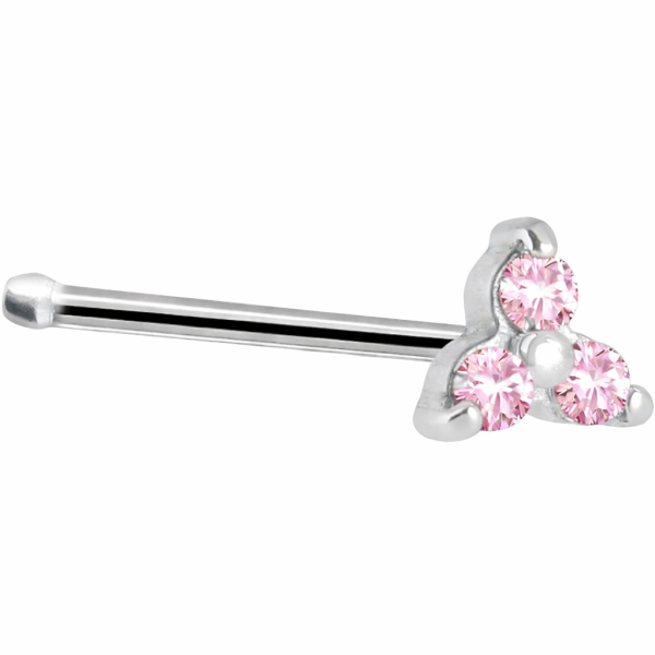 Aro nariz recto de acero quirúrgico con 3 swarovski zirconia en 2 colores: blancos y rosado, engarzados y organizados en forma de trinidad. el grosor de la pieza es de 0.8mm x 6.5mm de grosor y el diseño trinity es de 3.3mm.