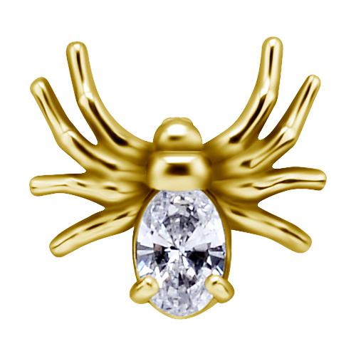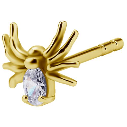 par de aros de acero quirurgico dorado diseño araña con 1 circón engarzado en forma de “gota”. las medidas de la araña son de 6.8 x 6.5mm. puedes elegir entre el par o unidad. tiene cierre de mariposa. el grosor del eje es de 0.8mm. el ajuste del largo es regulable en dos  posiciones a 6.5 y 7.5mm.