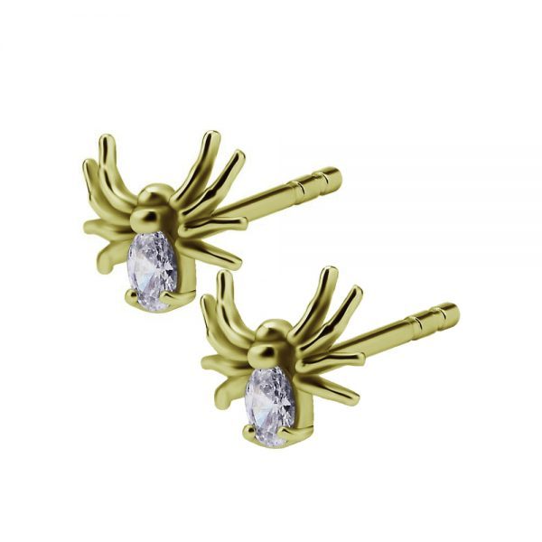 Par de aros de acero quirurgico dorado diseño araña con 1 circón engarzado