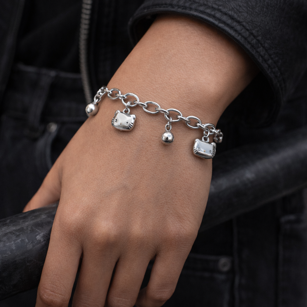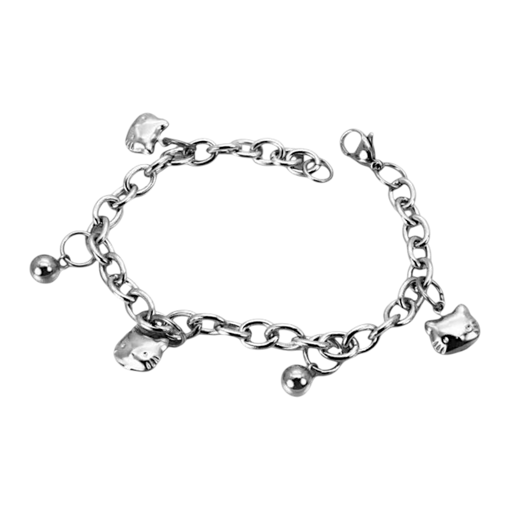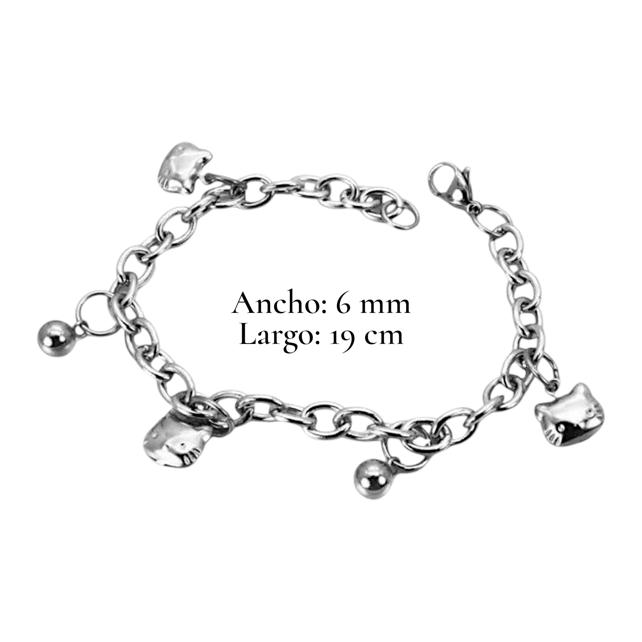 pulsera de acero quirúrgico de eslabones simples con gatos y bolitas colgantes. el largo de la pulsera es de 190mm y eslabones de 6.0mm de grosor.