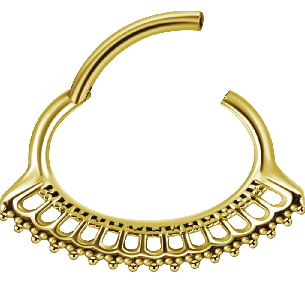 septum / daith de acero quirurgico ovalado diseño afghan. tiene un ionizado de oro puro de 24 kilates. esta joya está diseñada para ser usada en el «daith» del cartílago de la oreja o en el «septum» de la nariz. la argolla tiene  sistema de apertura clicker con bisagra, lo que te permite una instalación fácil y rápida