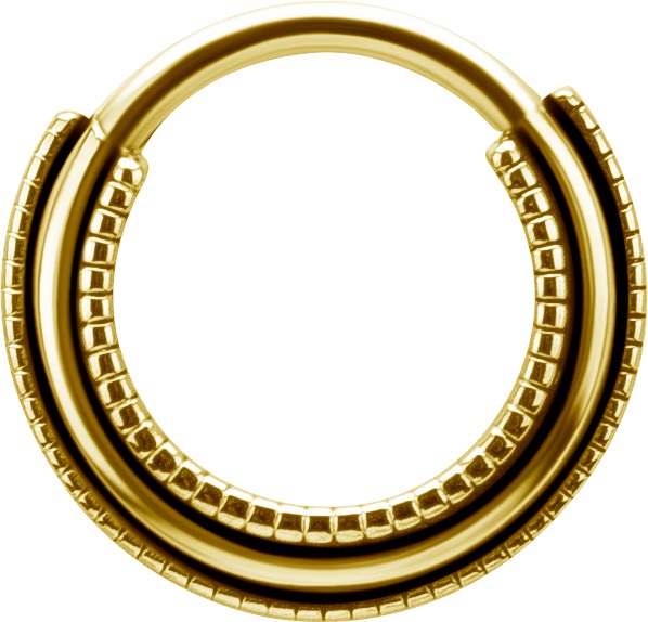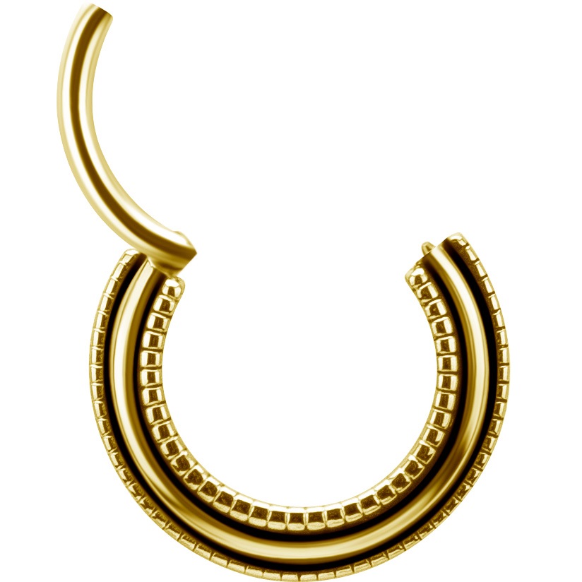 argolla septum / helix de acero quirúrgico dorado con diseño de tres escalones con microgranulados y un tratamiento llamado “oxidado”que hace que resalte más el diseño de esta joya. tiene un ionizado de oro puro de 24 kilates.  todos nuestros septum tienen el sistema de apertura clicker con bisagra, lo que te permite una instalación rápida, sencilla y segura.